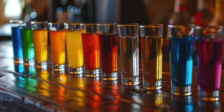 shot glasses filled with vibrant and colorful drinks sits on a sleek bar counter. The various hues reflect light and create an energetic atmosphere, perfect for a night out.