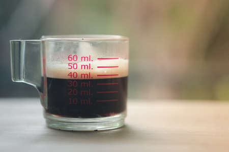 Close up of an espresso shot glass in an espresso machine and the unfocused hand of a barista working in the background