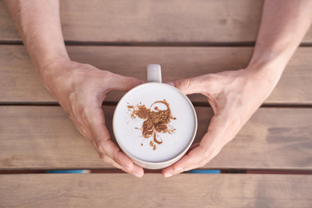 Caucasian male adult holding coffee mug with artistic foam design on wooden table.