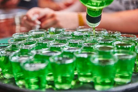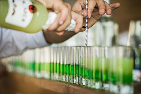Bartender hand pouring alcoholic Green liquid drink in restaurant, pub or bar in shot glasses standing on the counter out concept