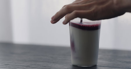mix natural berry juice in organic yogurt in tumbler glass on black wood table with copy space