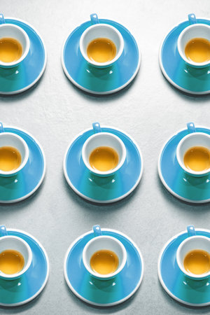 Top View of Colorful Coffee Cups Arranged in Neat Pattern on Light Surface, Close Up