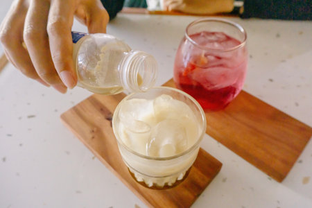 A captivating close-up of iced latte being poured into a glass, with a refreshing strawberry squash drink on the side