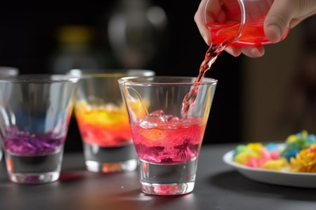 Close up photo of hands of a bartender pouring some drink into shot glasses