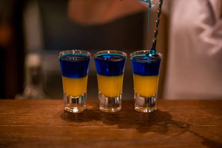 Alcoholic drinks in glass stacks on a wooden table. Blue curacao and lemon liqueurs.