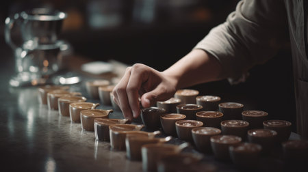 A vertical shot of a barmen's hand pouring alcohol drink in cups