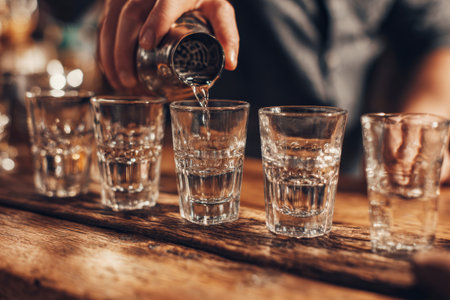 Hands expertly pour alcohol into shot glasses on a warm wooden bar, creating a festive atmosphere perfect for enjoying time with friends.