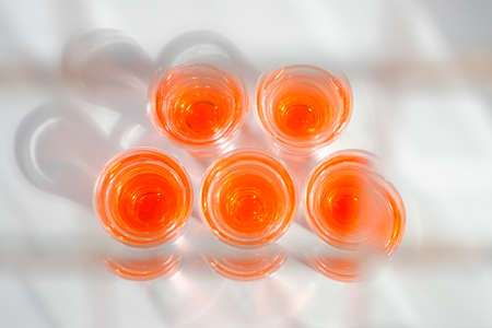 Single-color opaque cocktails, a set of shots in one row, five servings, with the taste of pineapple, orange, apricot, peach. Side view Isolated black background. Drink for the menu