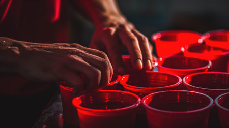 Red plastic cups arranged for a game, illuminated by dramatic red lighting