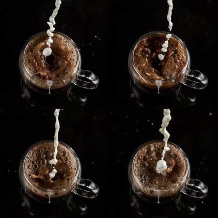 Set of four cups, pouring process of milk into glass cup full of cocoa, splashes, drops and froth around glass cup against black background