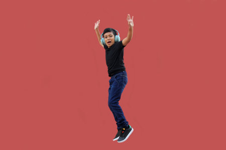9 year old Latino boy jumps with excitement and happiness while using his headphones to listen to music