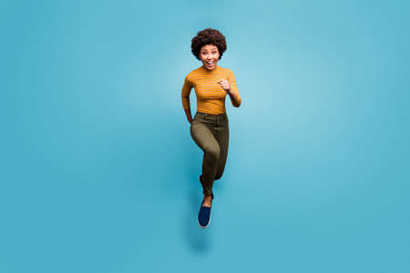Full length photo of beautiful crazy lady jump high throwing long curly hairdo air rejoicing wear purple jumper green pants footwear isolated blue teal pastel color background