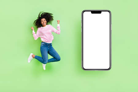 Full length view of cheerful lucky girl jump rejoice win cellphone ads poster isolated bright green color background