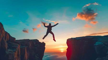 An image of a man bravely leaping from a cliff at sunset evoking feelings of adventure thrill and personal growth