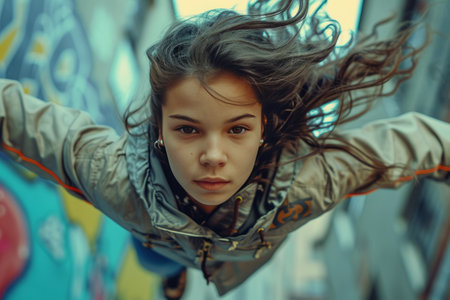 Portrait of a young female traceur standing on an urban rooftop before demonstrating parkour techniques. Walls of city houses painted with graffiti in the background. Top view.