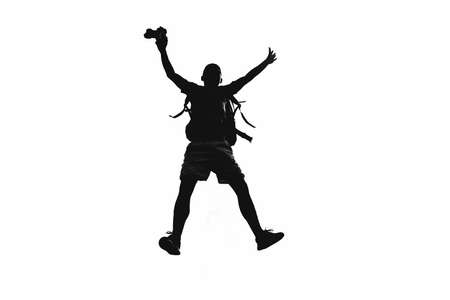 Traveler Young Man with backpack jumping hands holding mountains landscape on background Lifestyle Travel happy emotions success concept.