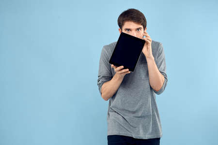 Emotional man with a tablet in the hands of a wireless device internet technology lifestyle blue background
