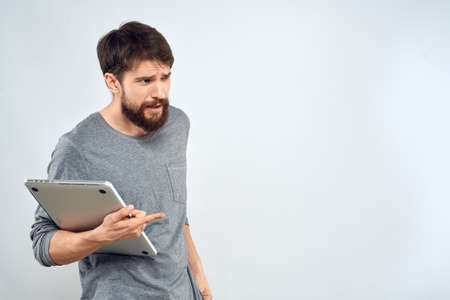 A man with a tablet in his hand internet technology communication gray jacket light background