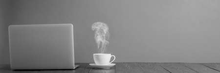 Close-up view of dark trendy workspace with laptop computer, coffee cup and office supplies with copy space