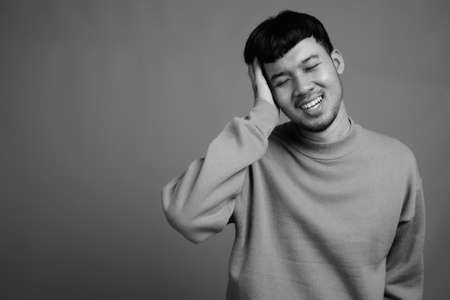 Portrait of handsome man on grey background, space for text. Black and white effect