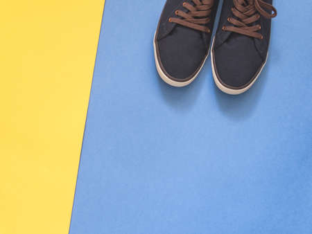 Black men sneakers on yellow background. Fashion blog or magazine concept. Men shoes, trendy sneakers, fashion, lifestyle. Mock up. Flat top view copy space minimal background.
