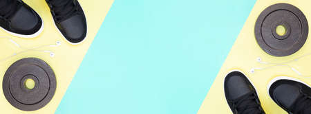 Banner with black sneakers for gym and fitness. Sports shoes, dumbbell disk and headphones on a turquoise and yellow background. Place for text. copyspace. flat lay. top view. Layout for design.