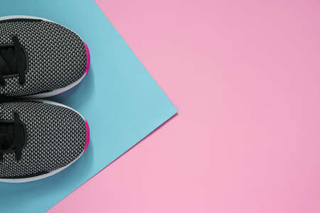 A pair of sport shoes on multiclored surface. New black and white woman sneakers on pink and blue pastel background with copy space. Top view, flat lay
