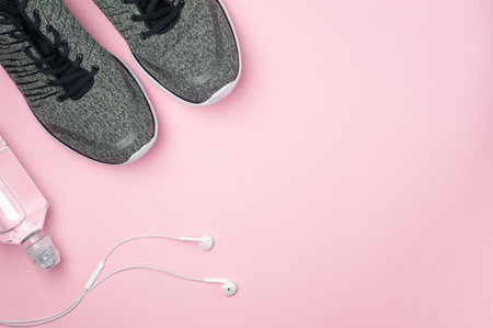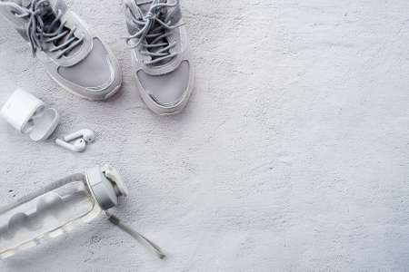 Healthy lifestyle and fitness in sports, morning jogging. Sneakers, smart fitness tracker, wireless headphones and a water bottle on a gray background. Top view and flat lay.