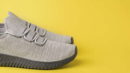 Stylish gray unisex sneakers on a yellow background. Sports lifestyle. Colors 2021.