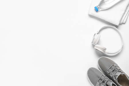 Fitness and healthy active lifestyle background concept. Training sneakers, water bottle and headphones on wooden backdrop. Top view with space for your text.