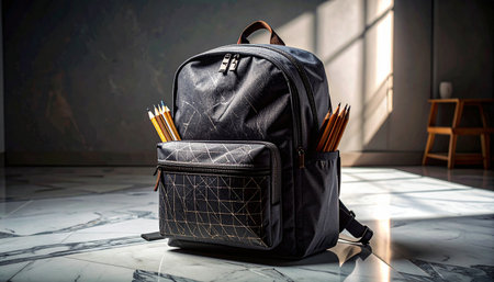 Stylish black leather backpack on wood floor against dark backdrop elegance