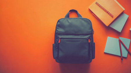 This image features a stylish black backpack positioned on a bright orange background with various stationery items, perfect for school or office settings.