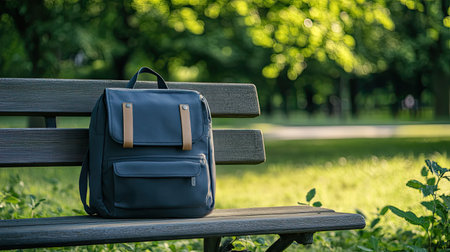 A stylish backpack casually rests on a wooden bench in a sunny park, surrounded by vibrant greenery, inviting moments of relaxation and exploration.