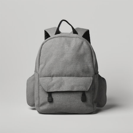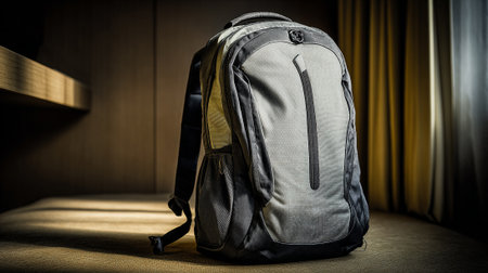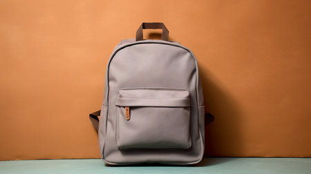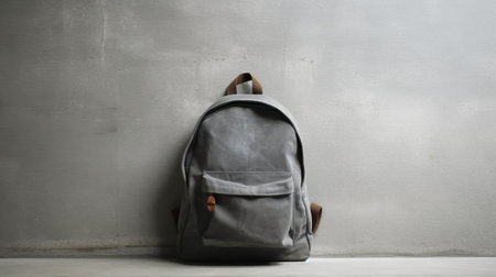 A stylish gray backpack stands alone against a wall in a modern interior, highlighting its simple design and functional storage options for travel or school.