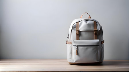 A clean and simple white backpack with brown leather accents sits on a wooden surface against a light grey background. The backpack features a small front pocket and is perfect for showcasing your brand or product.