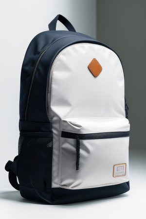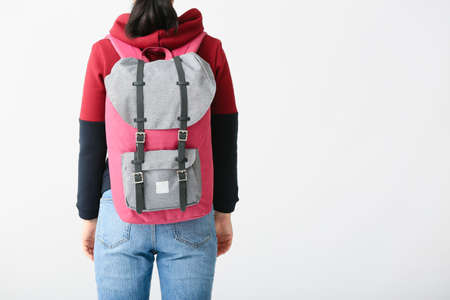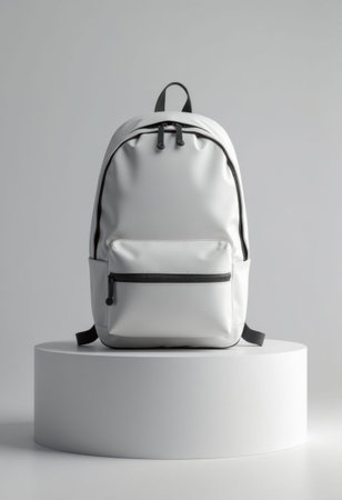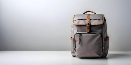 Clean white backpack on minimal background. Vacation and travel concept. Copy space for text.