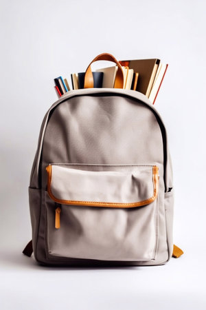 Gray backpack filled with notebooks and folders against pastel green background, representing student education and organization.