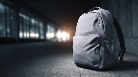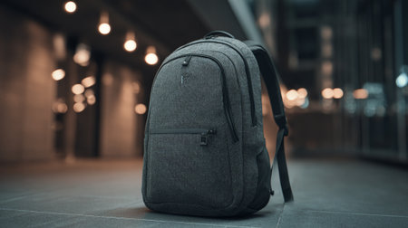 Stylish gray backpack resting indoors on gray tiles with blurred lights