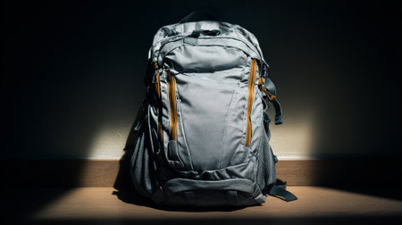 Backpack on Wood Floor with Dramatic Lighting Against a Dark Wall