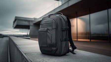 Sleek Modern Backpack on Concrete Ledge Against Abstract Architectural Background