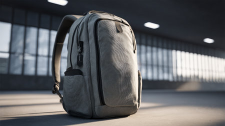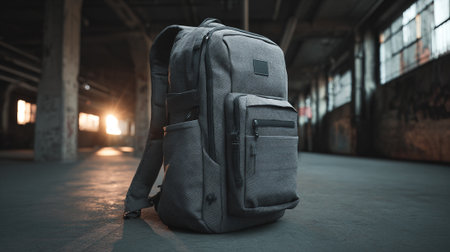 Modern gray backpack stands in empty industrial interior with sunlight streaming through the windows
