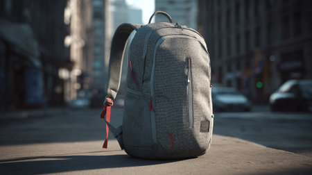 Urban Gray Backpack Ready for Commute in Sleek Setting with Red Accents