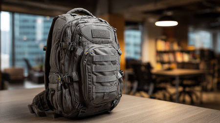 Gray Tactical Backpack Placed on a Wooden Table in an Office