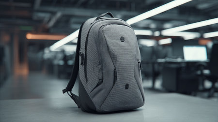 Professional gray backpack stands out against a modern, bright, blurry office backdrop