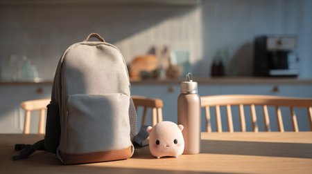 Minimalist home scene, kitchen table with modern backpack, water bottle, and cute plush toy, softly lit by morning light