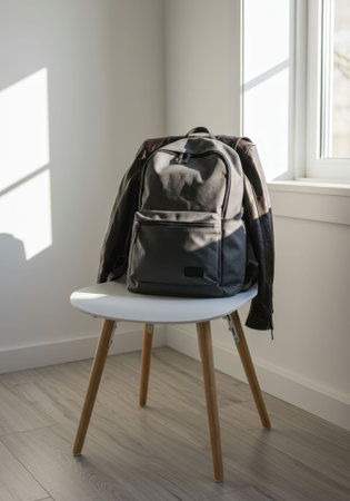 Everyday essentials of a gray backpack and brown jacket on a modern stool indoors for travel, daily routine, and a simple casual still life concept.