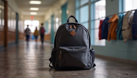 Backpack Sitting in an Empty Hallway with Overheard Lighting Fixtures