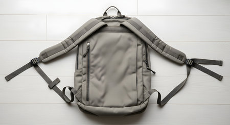 A minimalist flat-lay shot of a grey backpack lying on a white wooden surface. The back straps are visible, showcasing the bag's design and functionality for travel, school, or daily commuting. The clean, neutral background emphasizes the modern and practical style of the backpack.