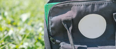 banner, black school bag on a grass. back to school concept. backpack with book. education concept. learning at school or univercity.