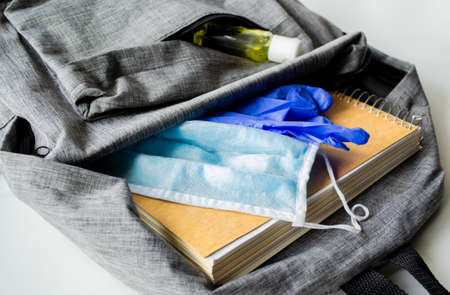 Backpack with a sanitizer, mask, gloves, and notebook. Concept of study during a pandemic, travel with personal protection measures.